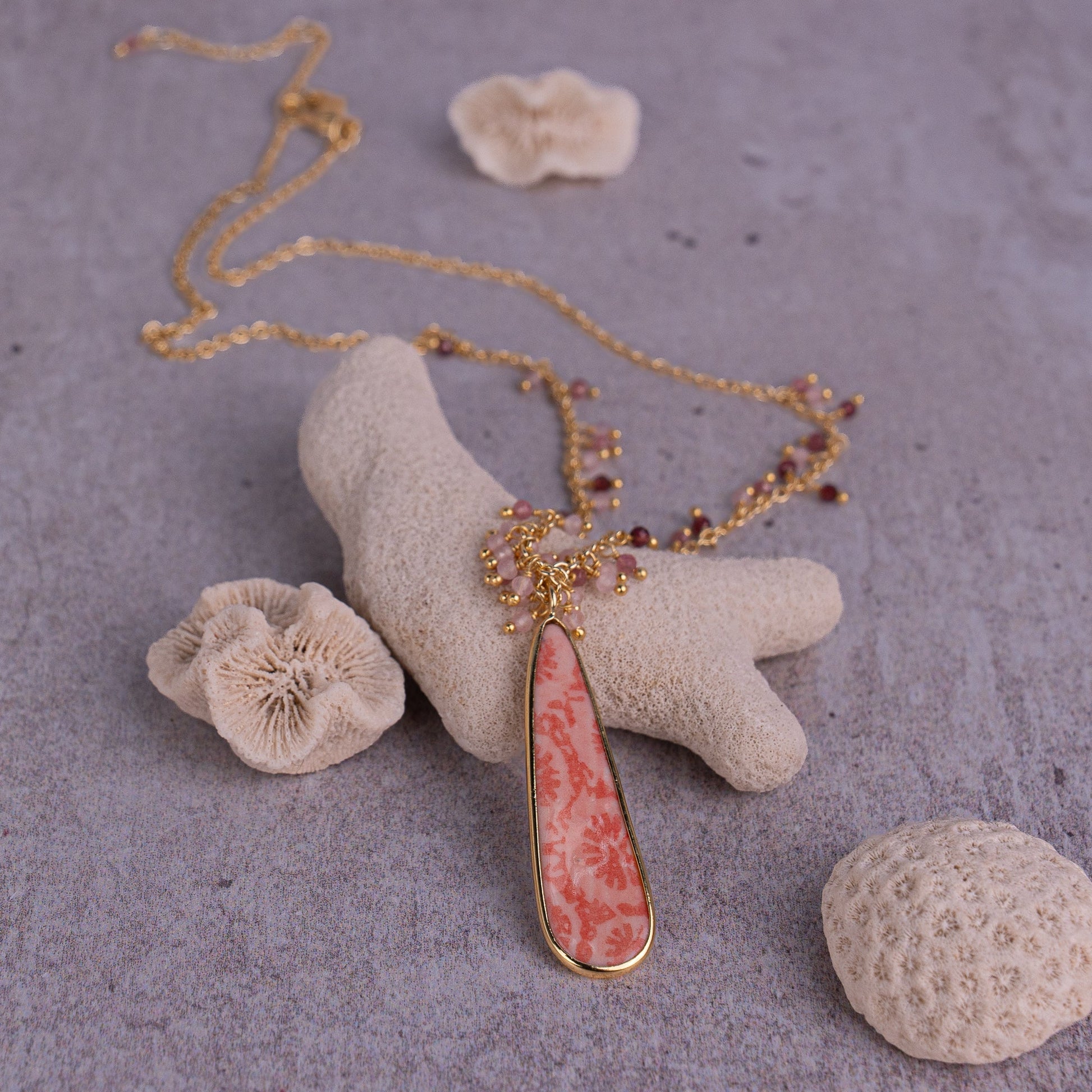 Each piece in our Porcelain Jewelry Collection is a work of art, crafted by hand, touched by fire, and inspired by the living beauty of coral reefs. Individually rolled, pressed, and shaped, every porcelain element goes through three separate firings, the final layer featuring luminous 18k gold lustre. Completed with gemstones and high-quality 18k gold-overlay earring wires (2-micron thickness, crafted to last), no two pieces are alike. Lightweight yet enduring, each unique piece captures the essence of ocean elegance. Designed not just to be worn, but treasured.