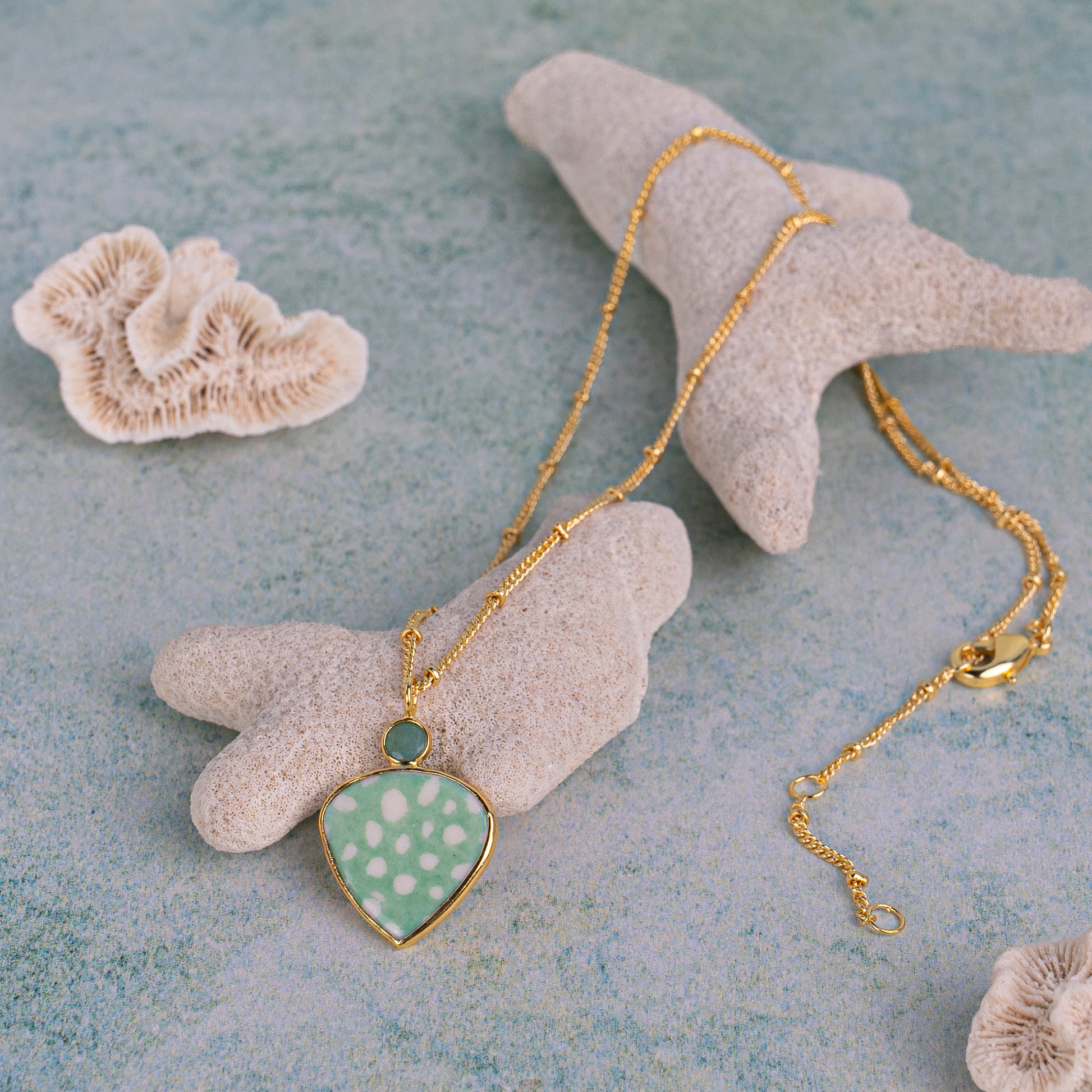 Each piece in our Porcelain Jewelry Collection is a work of art, crafted by hand, touched by fire, and inspired by the living beauty of coral reefs. Individually rolled, pressed, and shaped, every porcelain element goes through three separate firings, the final layer featuring luminous 18k gold lustre. Completed with gemstones and high-quality 18k gold-overlay earring wires (2-micron thickness, crafted to last), no two pieces are alike. Lightweight yet enduring, each unique piece captures the essence of ocean elegance. Designed not just to be worn, but treasured.