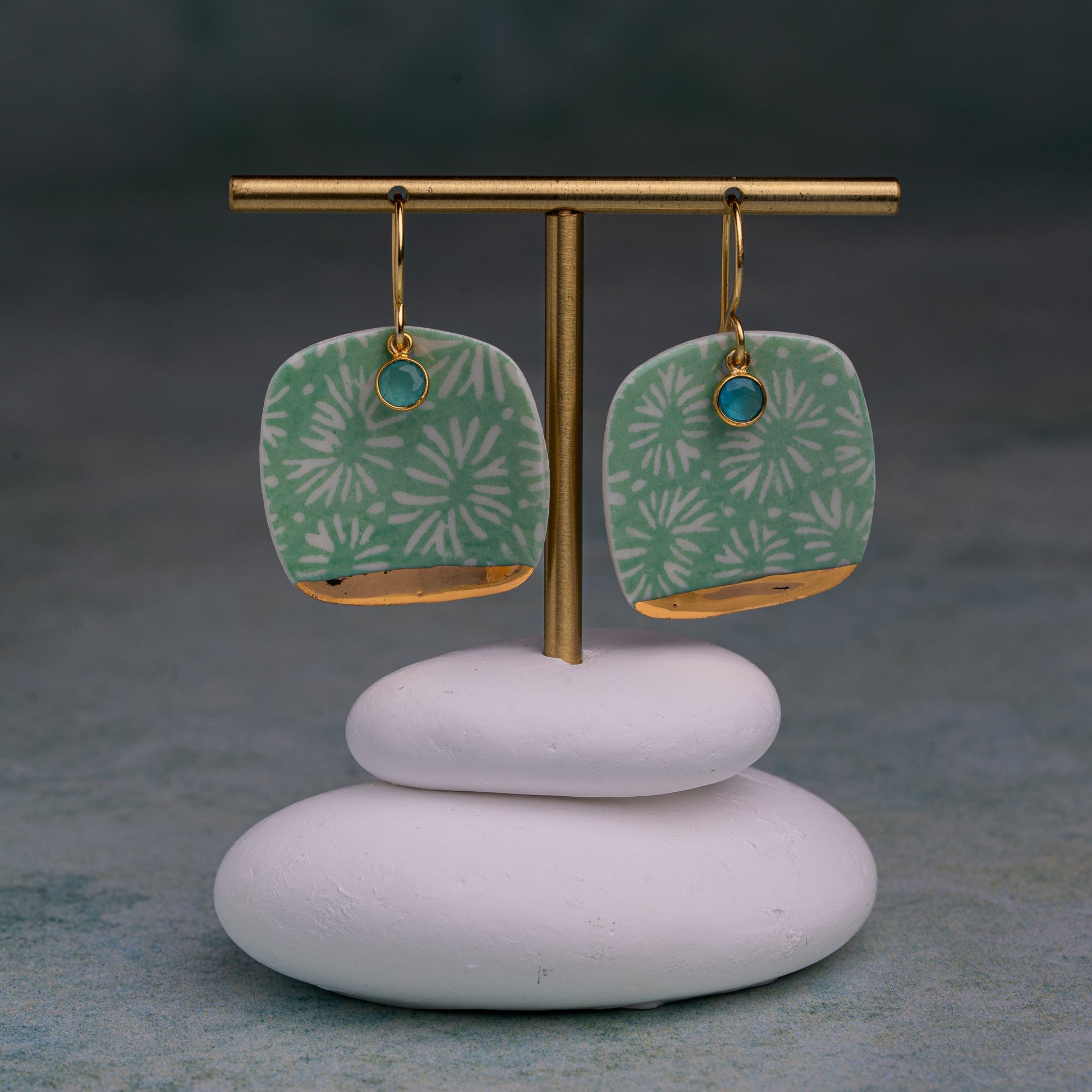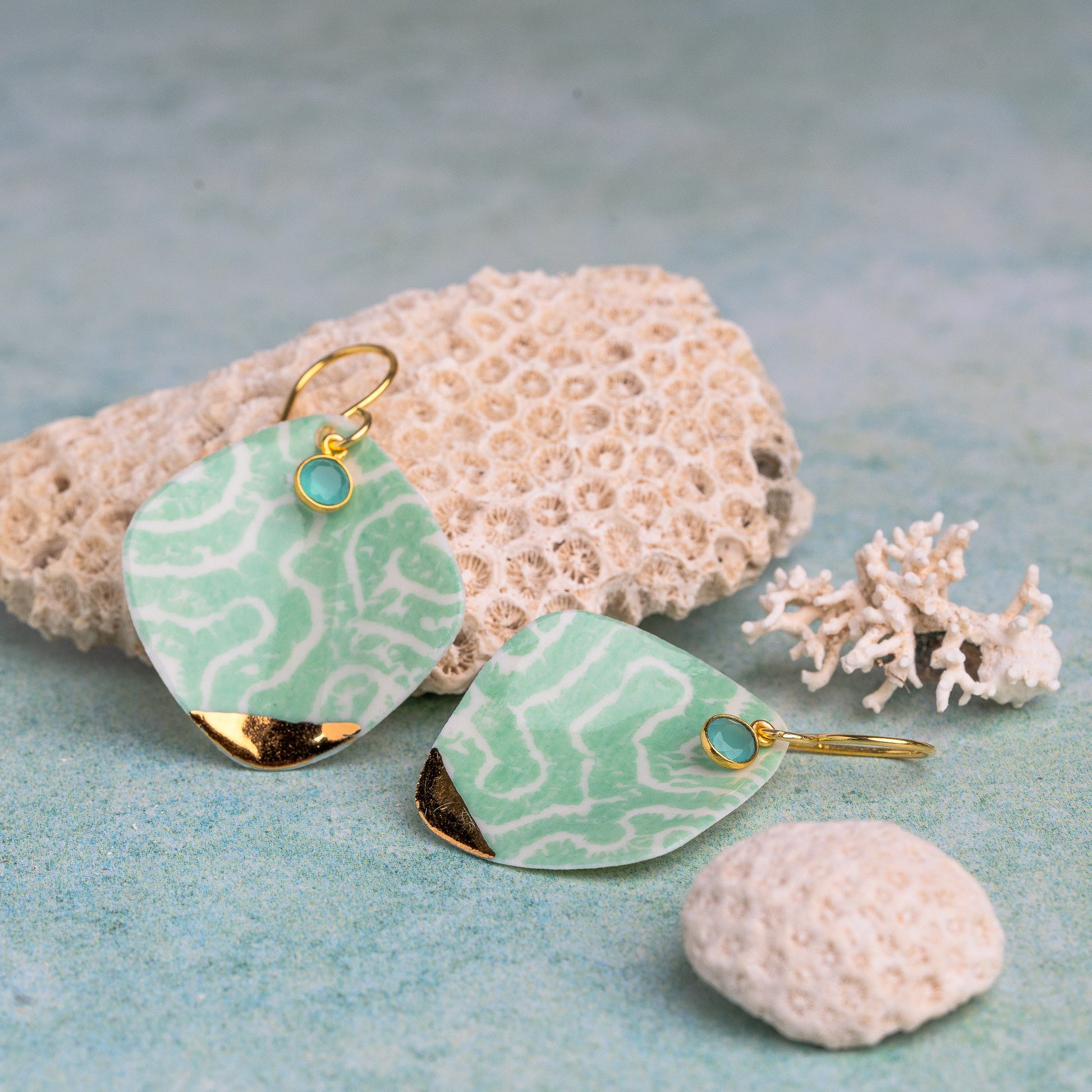 Each piece in our Porcelain Jewelry Collection is a work of art, crafted by hand, touched by fire, and inspired by the living beauty of coral reefs. Individually rolled, pressed, and shaped, every porcelain element goes through three separate firings, the final layer featuring luminous 18k gold lustre. Completed with gemstones and high-quality 18k gold-overlay earring wires (2-micron thickness, crafted to last), no two pieces are alike. Lightweight yet enduring, each unique piece captures the essence of ocean elegance. Designed not just to be worn, but treasured.