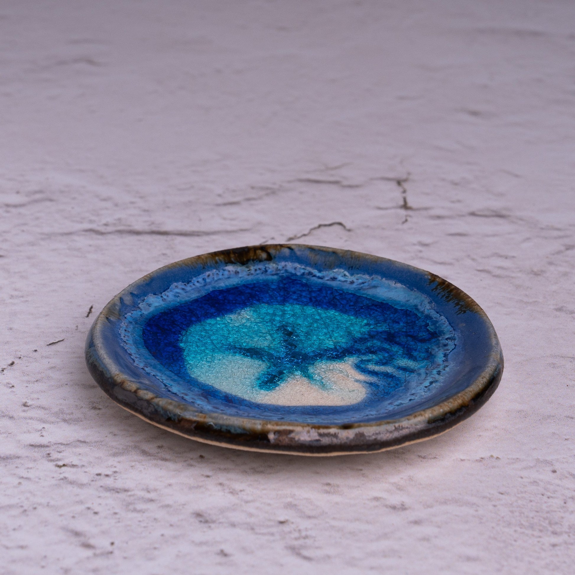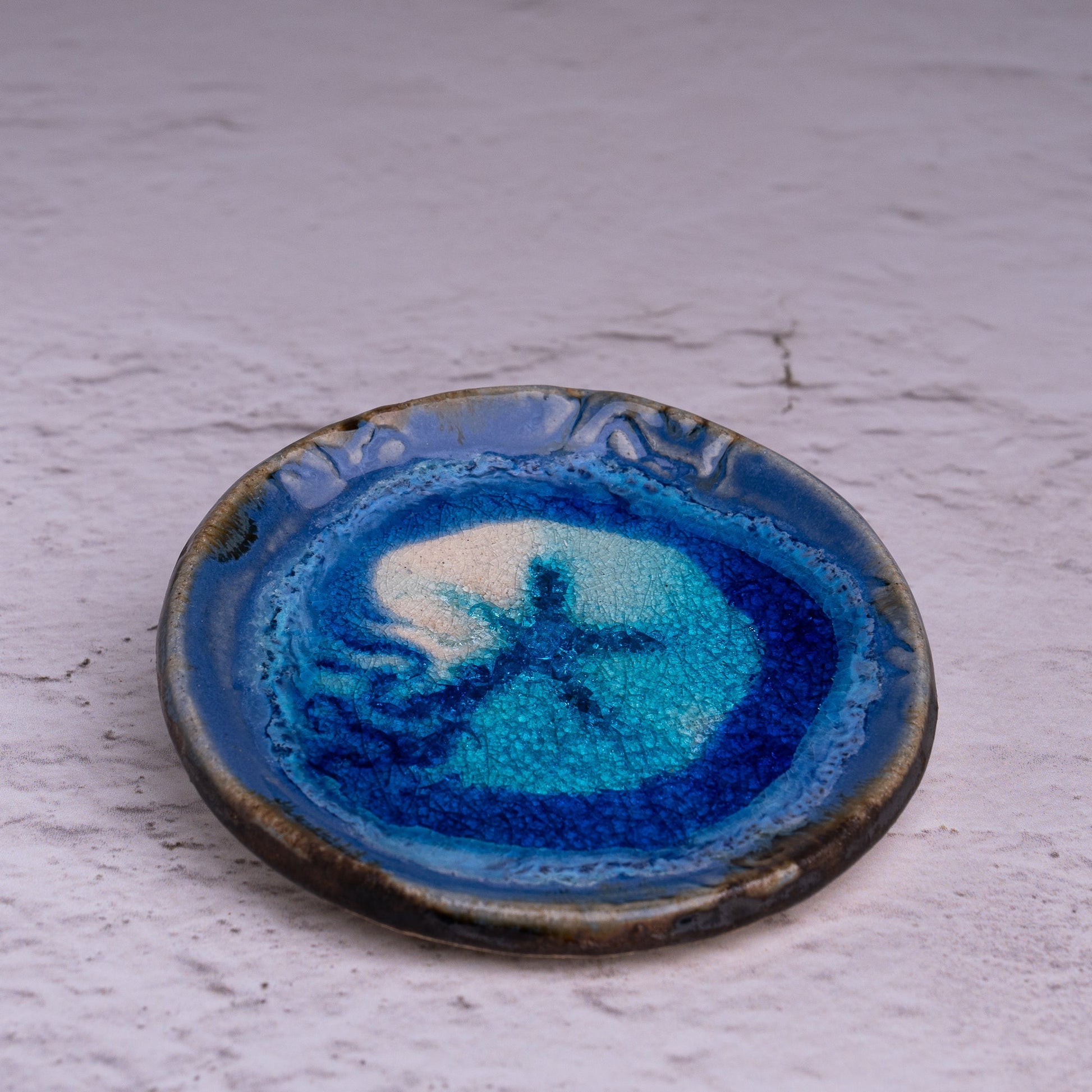 This Round dish is accented by luminous glass, imprinted with sea fan, starfish and coral textures, and glazed in deep sea blue. Perfect for jewelry, soaps, or small keepsakes.
