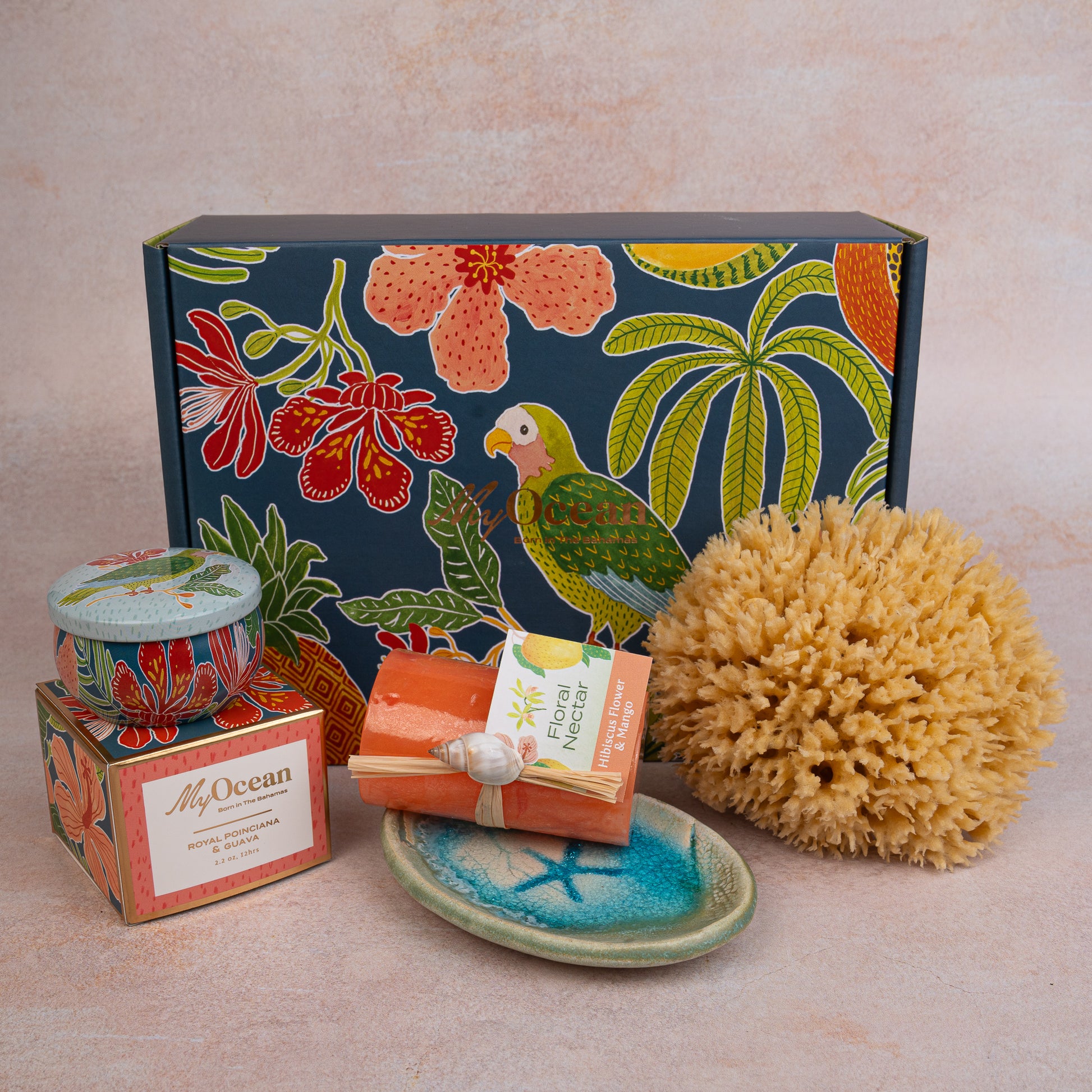 The Floral Nectar Gift Box is inspired by the sweet abundance of the Bahamian islands — where blossoms burst in radiant color, tropical fruits ripen beneath the summer sun, and the rare Bahama Parrot calls through the lush forest canopy of Abaco.